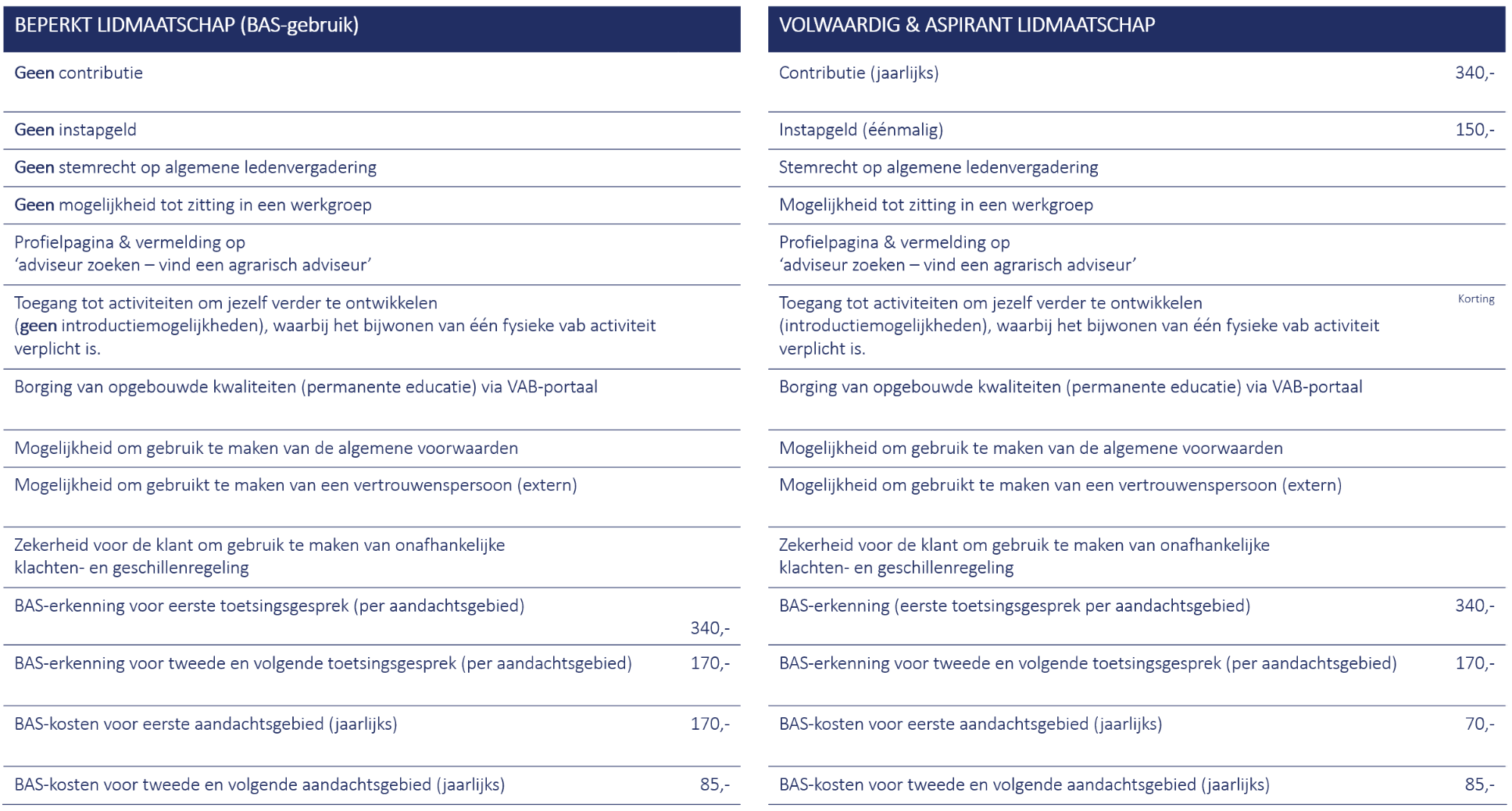 Via de VAB ontwikkel je je verder als agrarisch adviseur. Het lidmaatschap is de basis voor je AB-ontwikkeling en het behalen en onderhouden van BAS-erkenning. Daarmee maak je jouw professionaliteit zichtbaar en blijf je inzetbaar in trajecten waar erkenning steeds vaker een voorwaarde is.